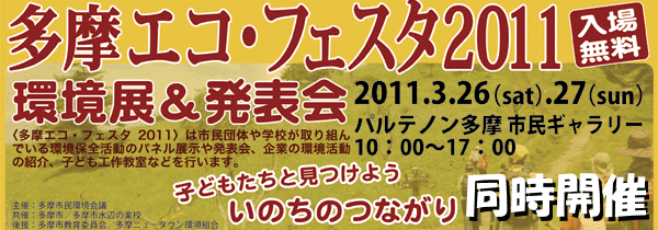 環境展&発表会~子どもたちと見つけよう、いのちのつながり~ [入場無料] 2011年3月26日(土)・27日(日) 10:00 ~ 17:00 会場:パルテノン多摩 市民ギャラリー | |