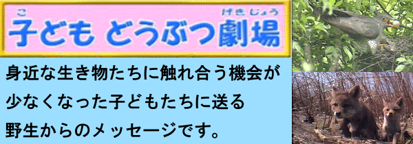 映画「子どもどうぶつ劇場」 カッコウの托卵&キツネ親子は河原暮らし (日本/2010/監督:岩崎雅典/30分) 第19回子どもアースビジョン賞 受賞 日本の風景にごく自然に溶け込んでいたカエルやメダカ・・・ そんな身近な“生きものたち“がいつの間にか姿を消しつつあります。 北は北海道から南は沖縄まで日本列島は南北に長く、島々も多く点在しています。 複雑な地形、気候、風土に培われた豊かで多様な自然― 日本列島には数多くの固有種や珍しい生きものたちが昔から住んでいるのです。 そんな生きものたちの生命あふれる姿を子どもたちに発進します。“生きものたち”の素顔を通し、豊かな自然の大切さを学んでもらう。 言うなれば、21世紀を生きる子どもたちに送る野生からのメッセージです。 カッコウの托卵-子育ては他人まかせ 他の鳥の巣に自分の卵を産みつけ、後は知らんぷり。カッコウのユニークな子育てと成長を追います。(八ヶ岳高原) キツネ親子は河原暮らし-お宿はどこ?! 人間の住むすぐ近くでたくましく生きるキツネの親子の姿を描きます。 (笛吹川) |