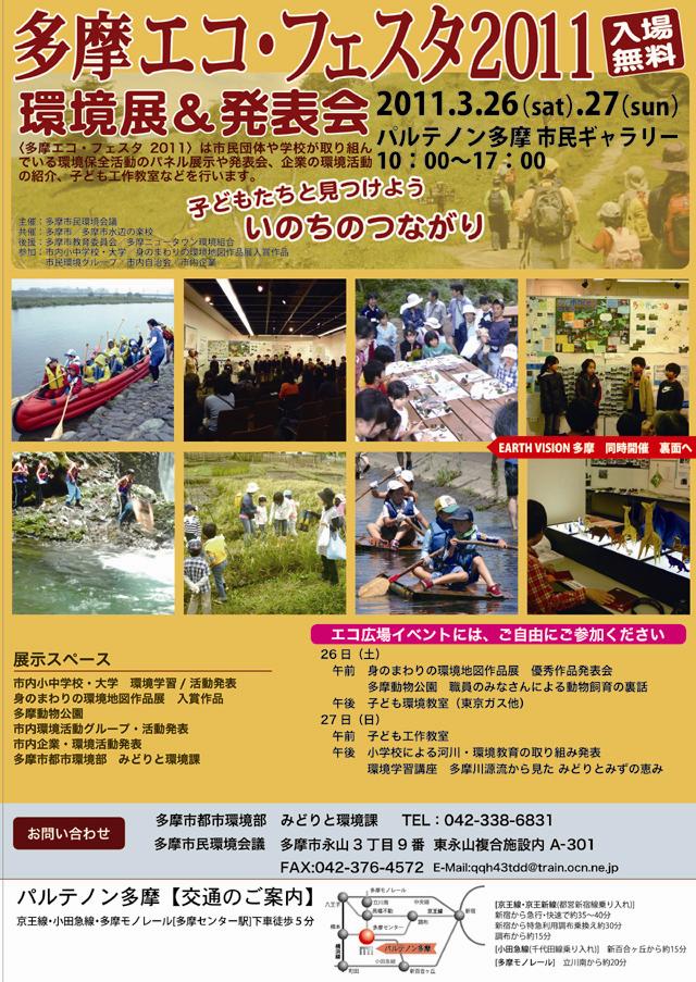 主催:多摩市民環境会議 共催:多摩市/多摩市水辺の学校 後援:多摩市教育委員会 多摩ニュータウン環境組合 多摩エコ・フェスタ2011チラシ |